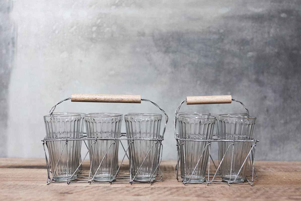This tea set is based on traditional glass tea sets found in north Africa and the East. The wire frame has a natural wood handle that holds 4 or 6 glasses, the glasses have a utilitarian look and ribbed finish.
