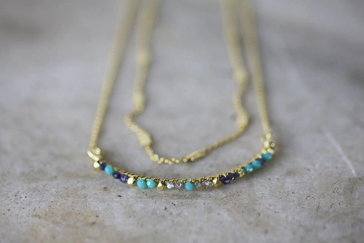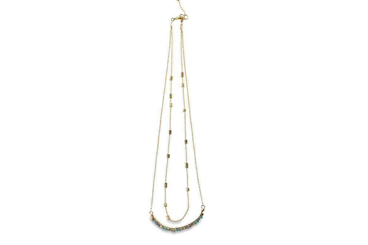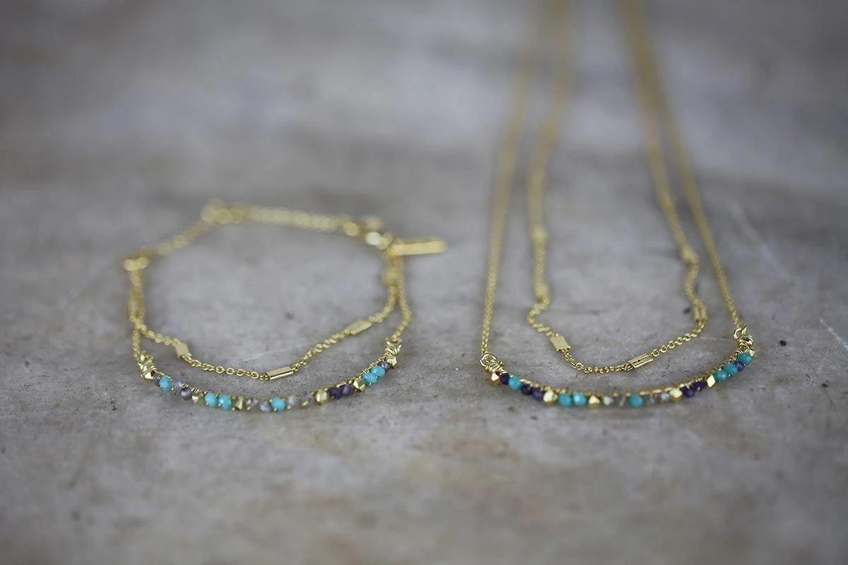 This stunning gold necklace has a striking double chain and bead work design made with a variety of natural stones in aqua shades.