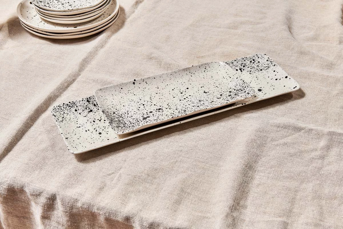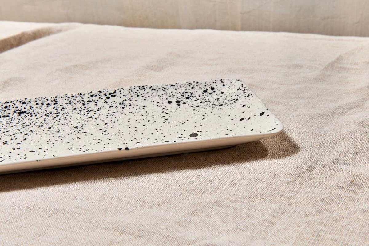 These large oblong serving platters have a smooth glaze that is decorated in a striking splatter pattern.
