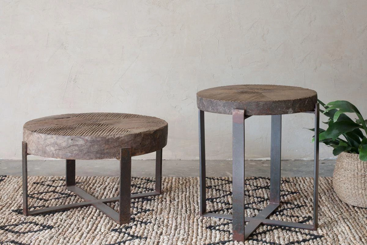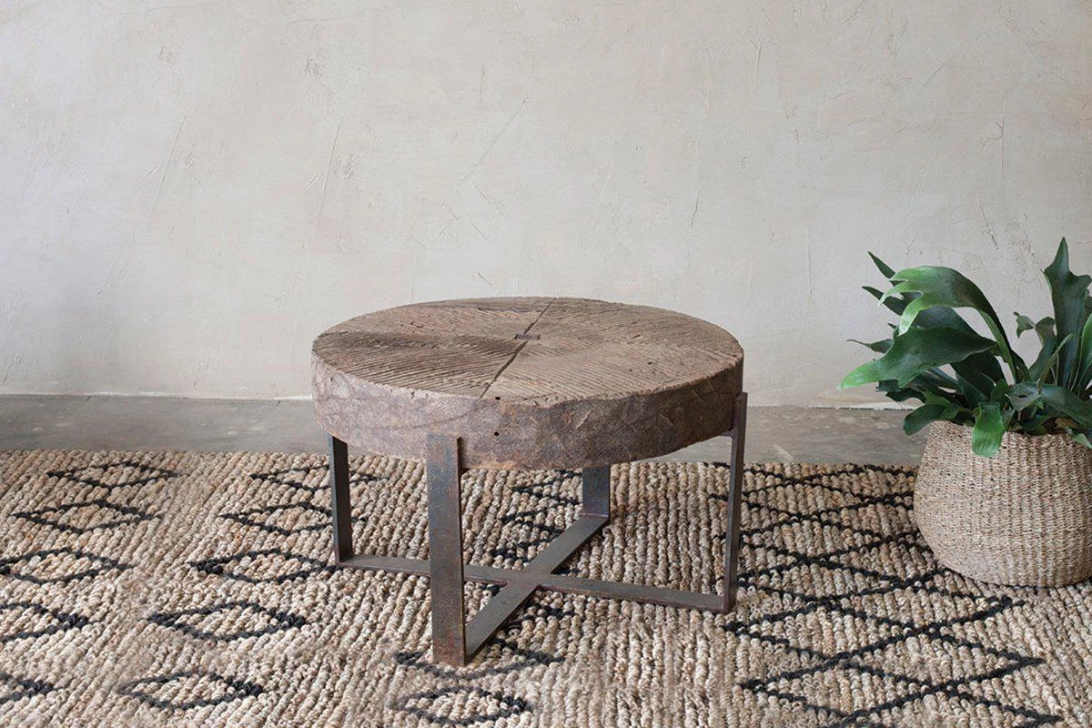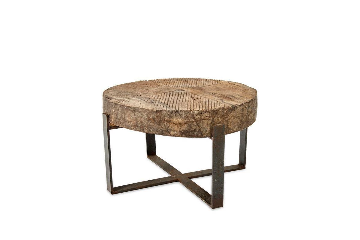 This circular reclaimed coffee table has a characterful finish. It is made from reclaimed herb grinders and each one illustrates the marks of its former use.