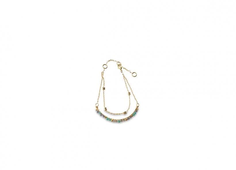 This stunning gold bracelet has a striking beadwork design made from natural stones in aqua shades.