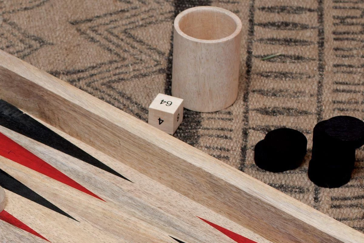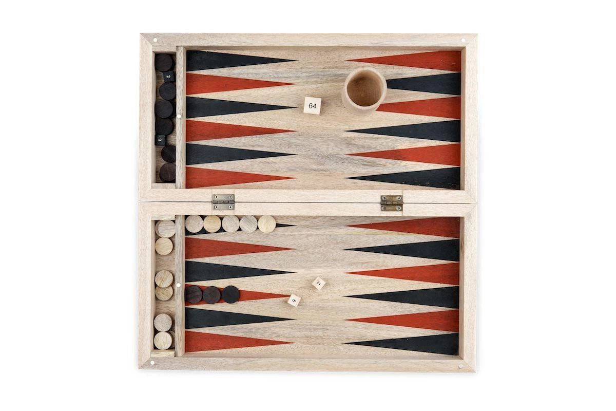 This stylish traditional backgammon set is handmade from sustainable mango wood. The board is hand painted and the set includes natural and hand painted wooden pieces.