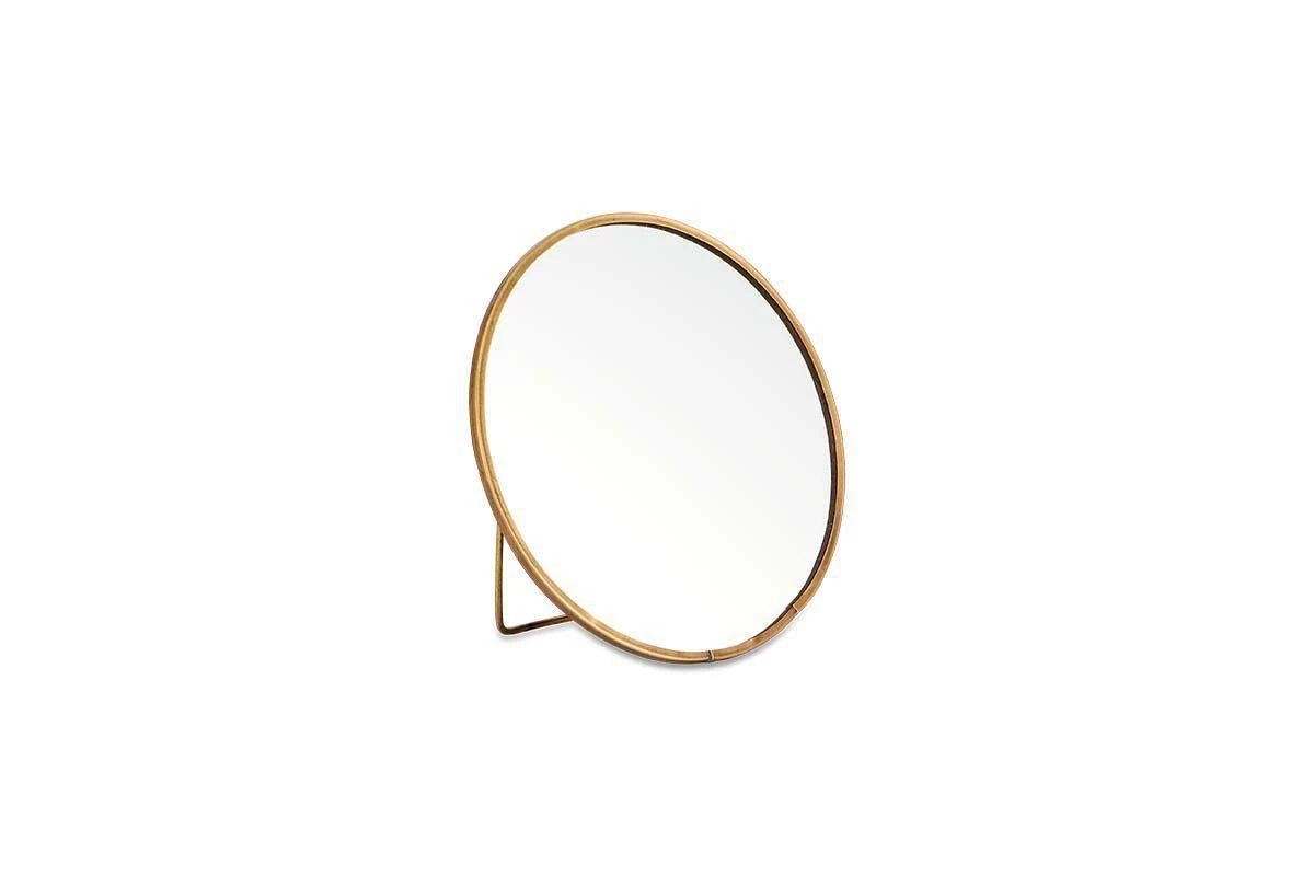 The back of this elegant mirror is made from brass with a brass stand.