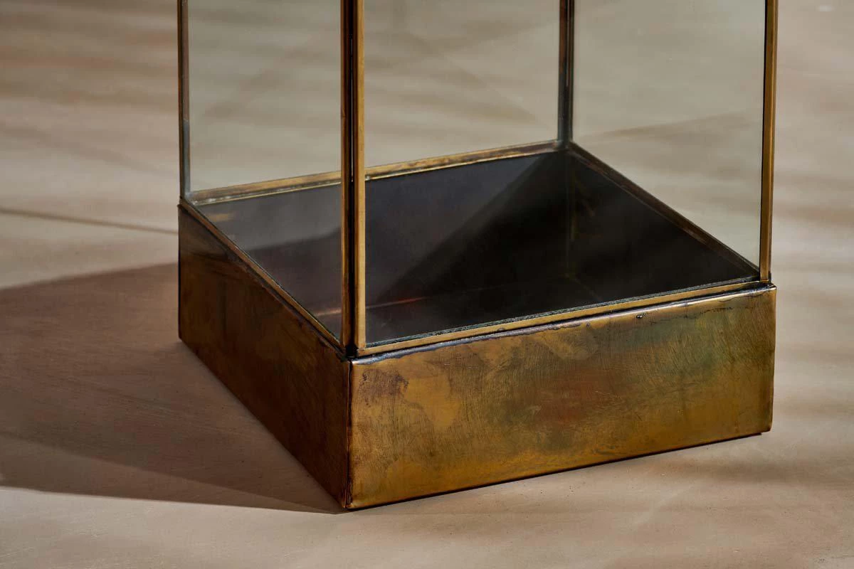Our tall Sampara Storm Lantern makes a striking centrepiece, its appealing antique patina is complimented with a deep brass base and elegant contours. Display with a church pillar candle and create a warm, soft atmospheric light.