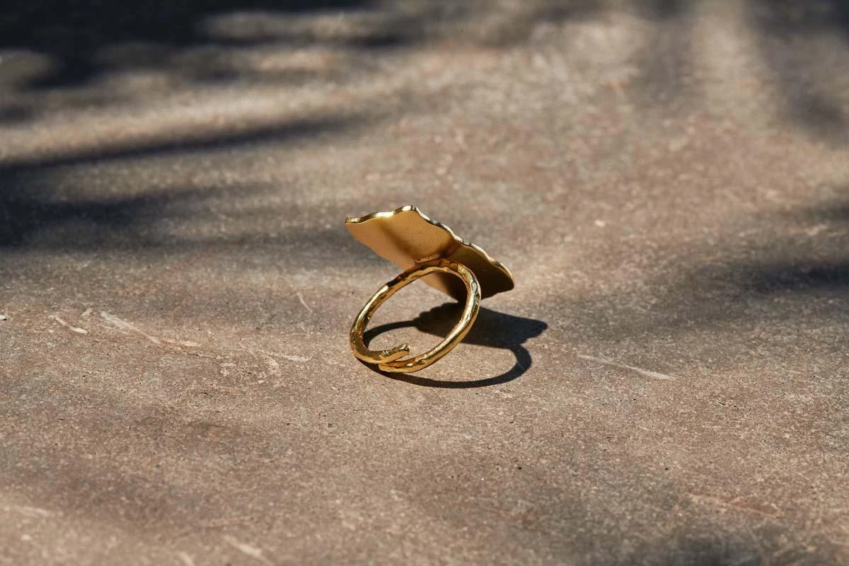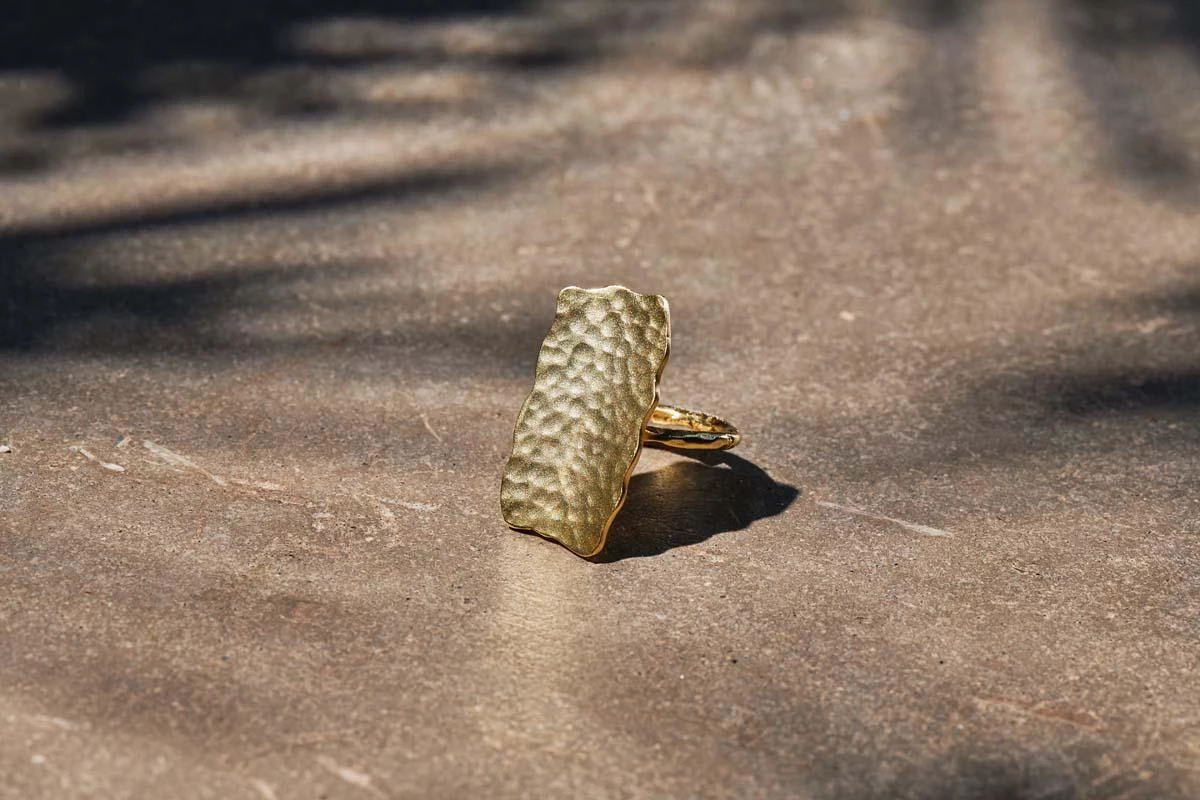 The organic shape of our Huron Ring has been beautifully hammered to create this appealing texture. Handcrafted from 22 karat gold. The ring has an adjustable gold band.