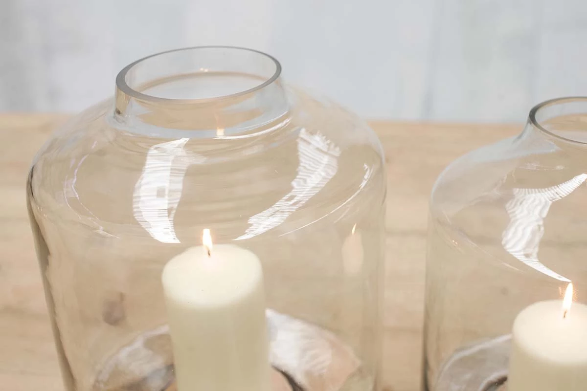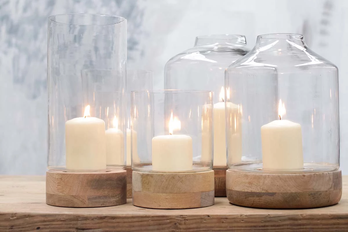 This small hurricane lantern has a tapered glass dome sitting atop a simple, sustainable mango wood base.