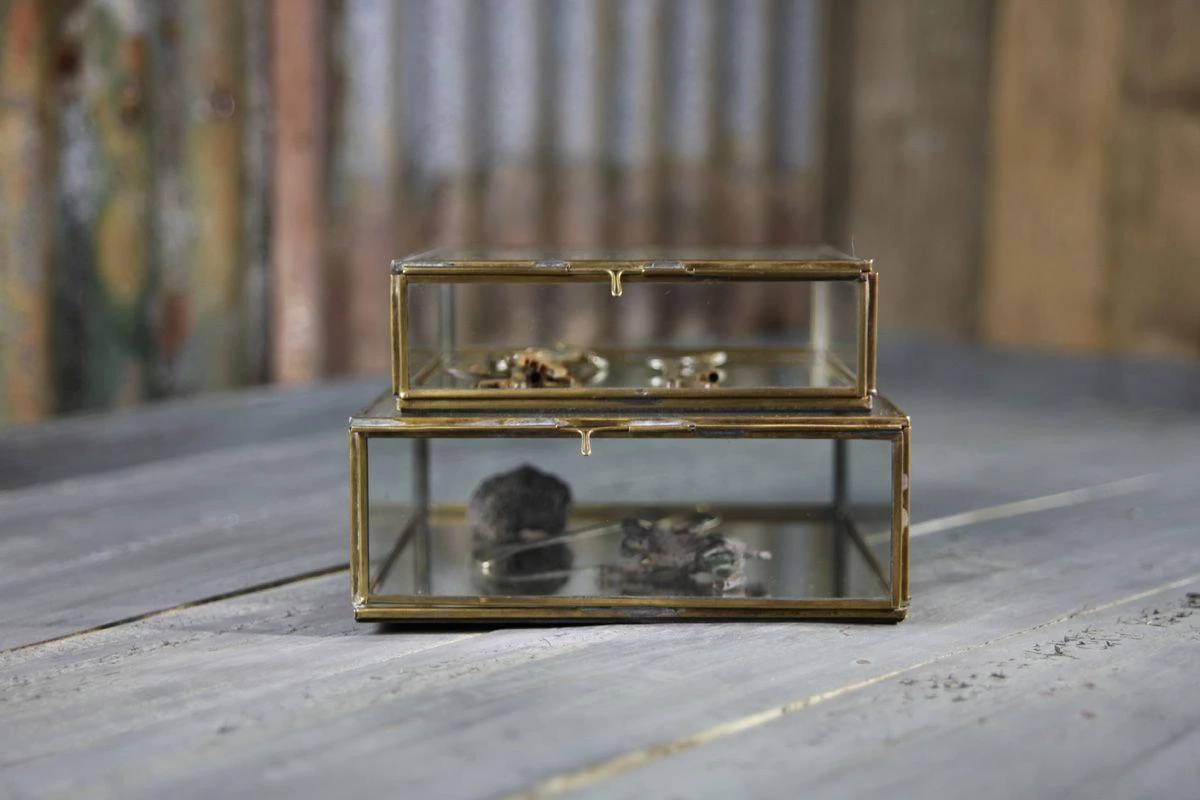 Organise your bits and bobs in these lovely glass storage boxes. Each one is handmade with a gorgeous antique brass edge, a mirrored base and has a quirky, vintage feel. Available in a choice of small or large box.