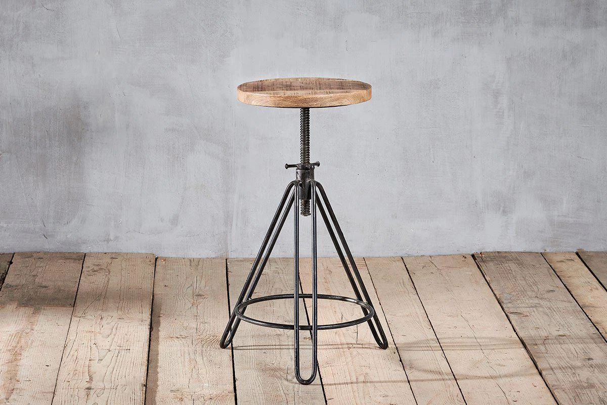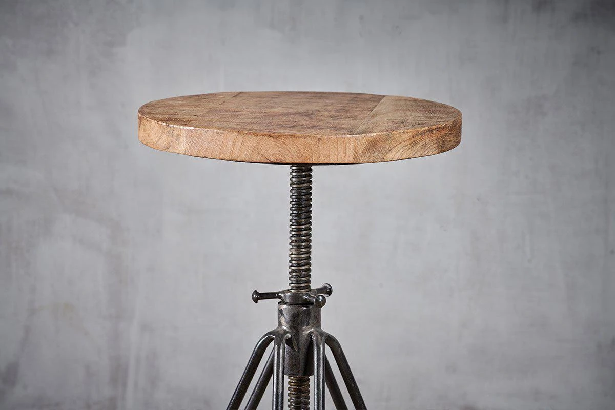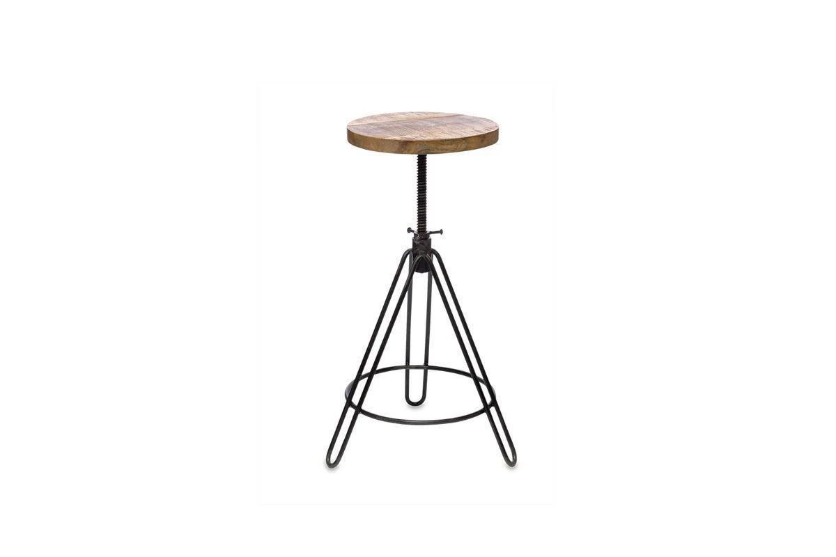 This industrial looking Arvi stool has an adjustable seat. The iron tripod base is finished with a solid, natural mango wood seat.
