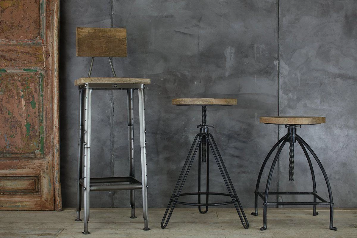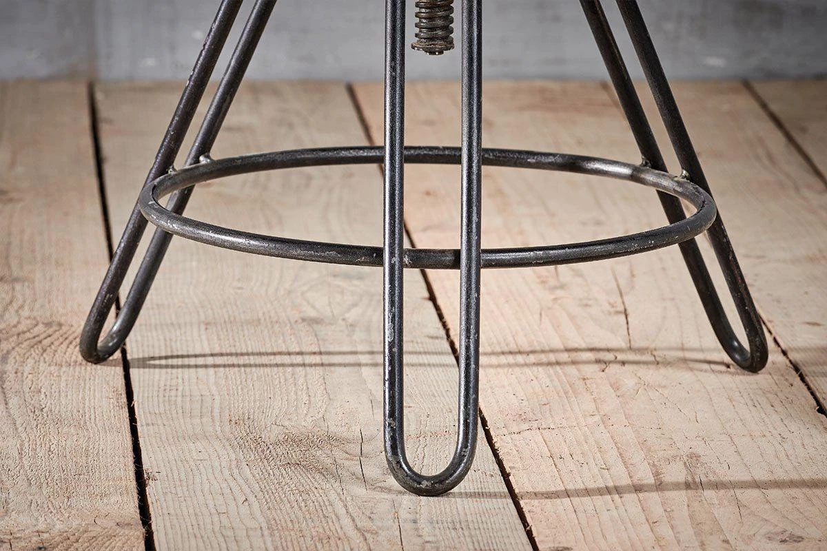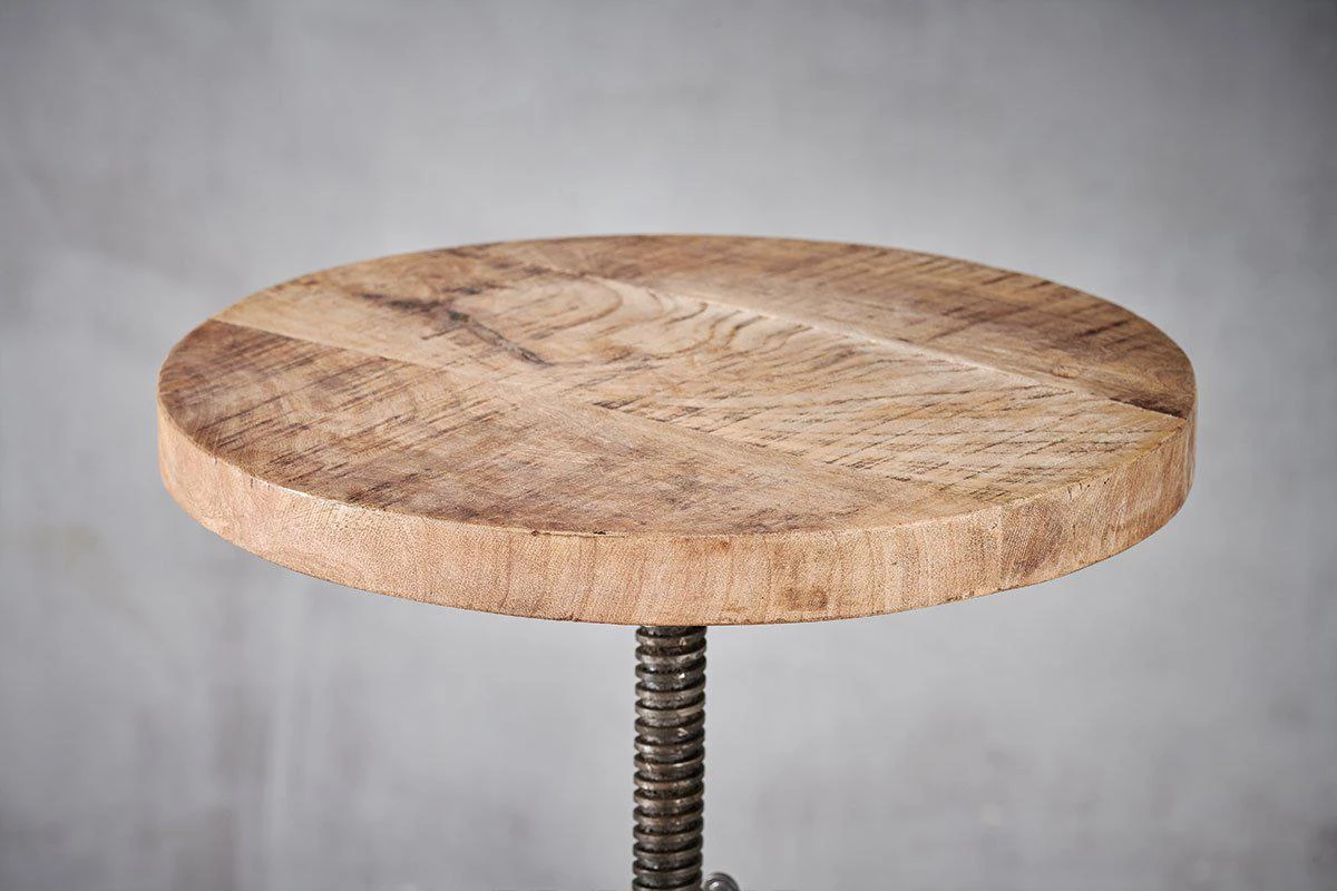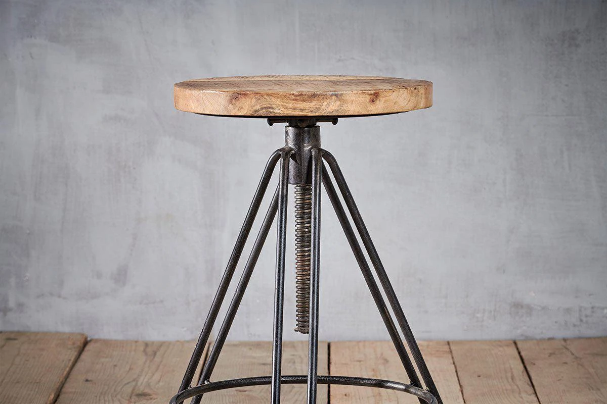 This industrial looking Arvi stool has an adjustable seat. The iron tripod base is finished with a solid, natural mango wood seat.