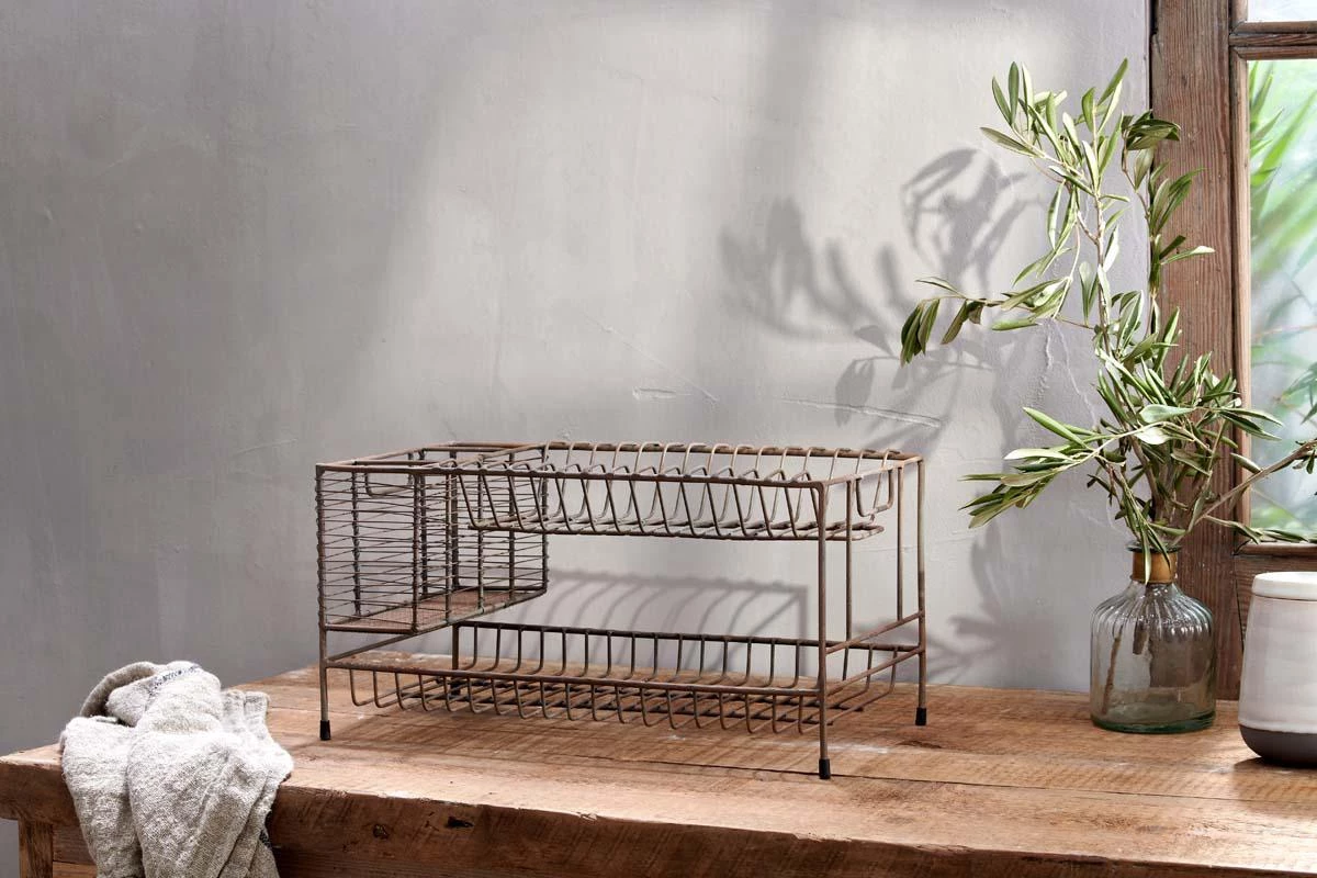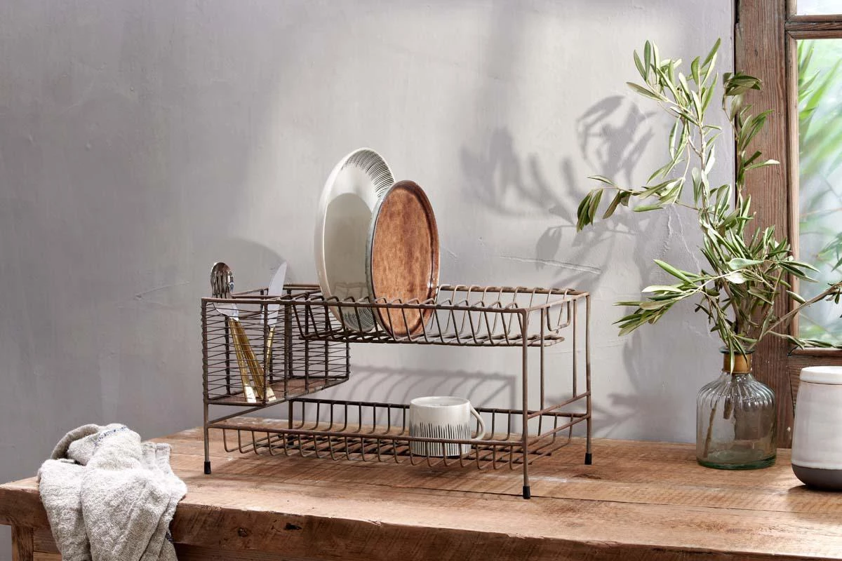 The utilitarian design of our Inkollu Dish Rack is given a touch of warmth with a subdued aged brass tone. This practical piece includes space for plates, bowls, and cutlery.