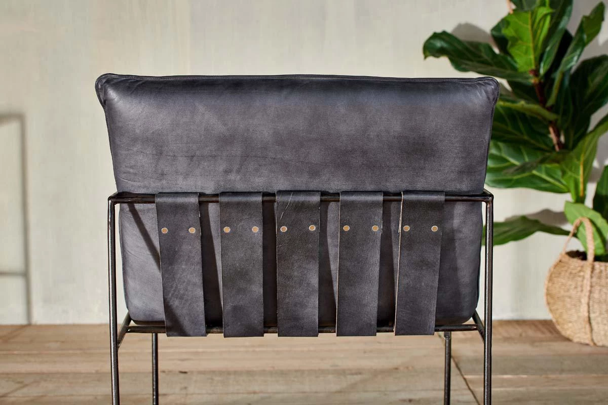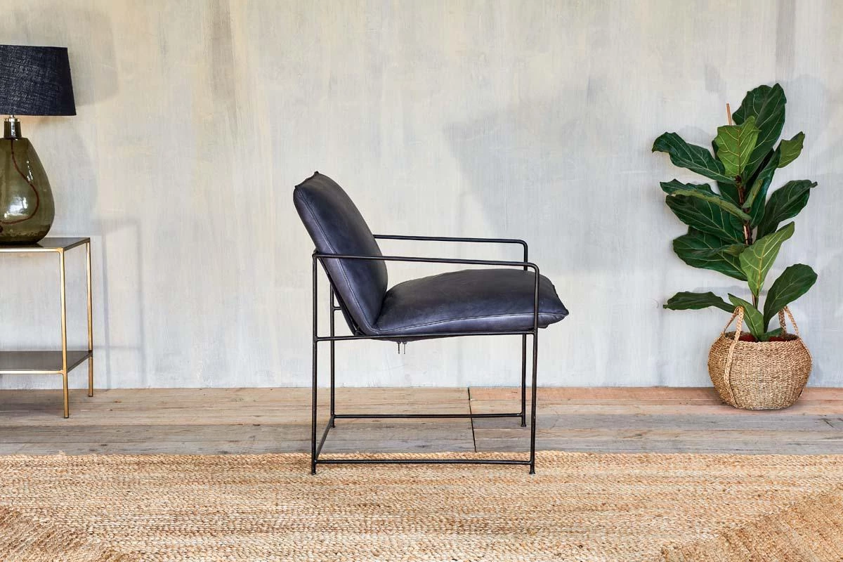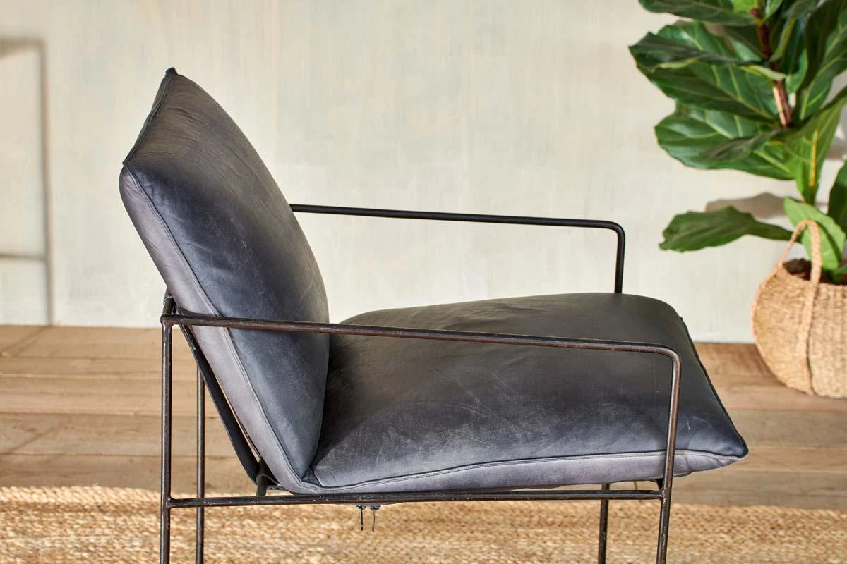 Stylish and comfortable, our Durium lounger combines distressed black leather in a sumptuous padded seat with a striking solid black rolled iron framework.