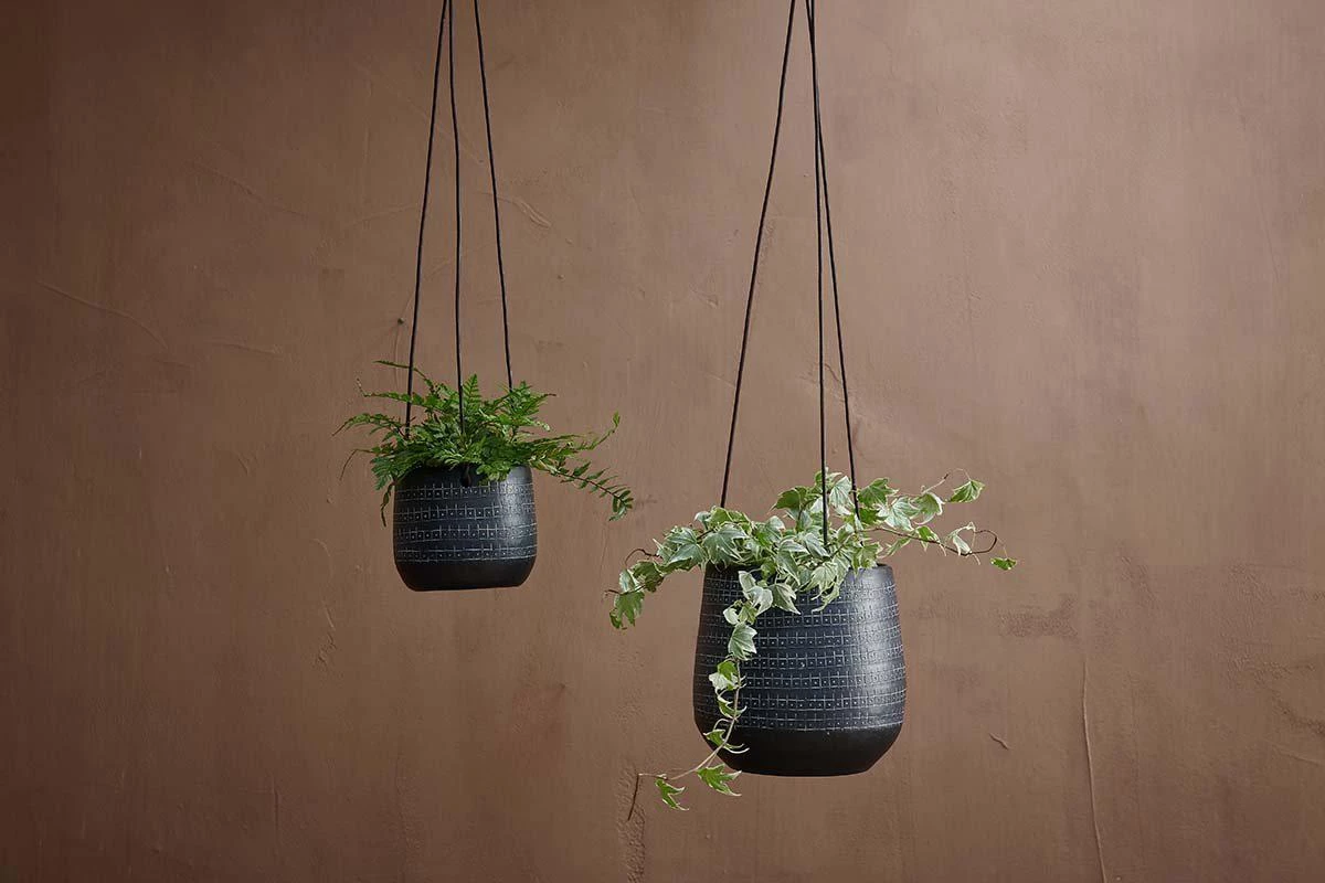 The eye-catching pattern on these Mahika hanging planters is beautifully crafted by hand. The design gives each one a unique feel and adds to their tactile qualities. The dark metal finish provides a stylish contrast to the verdant greens of indoor plants.