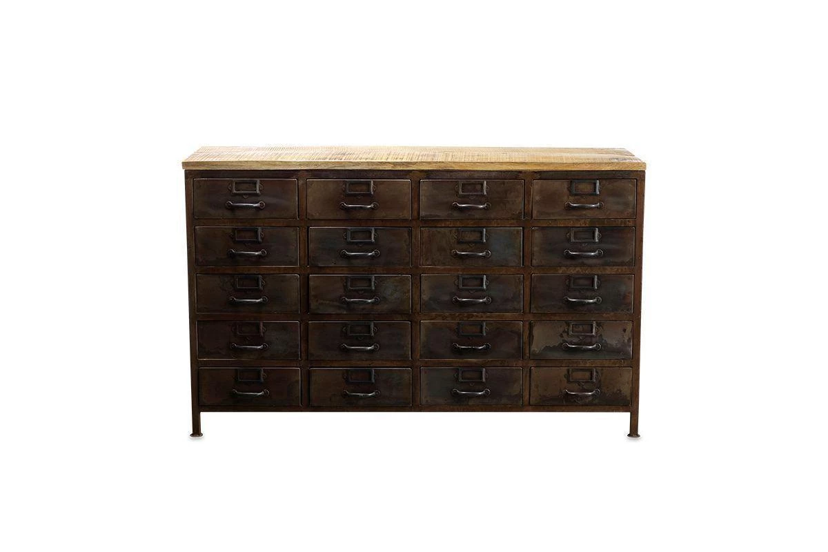 This timeless cabinet combines twenty metal drawers with metal label holders and a distressed black iron frame and a sustainable mango wood top.