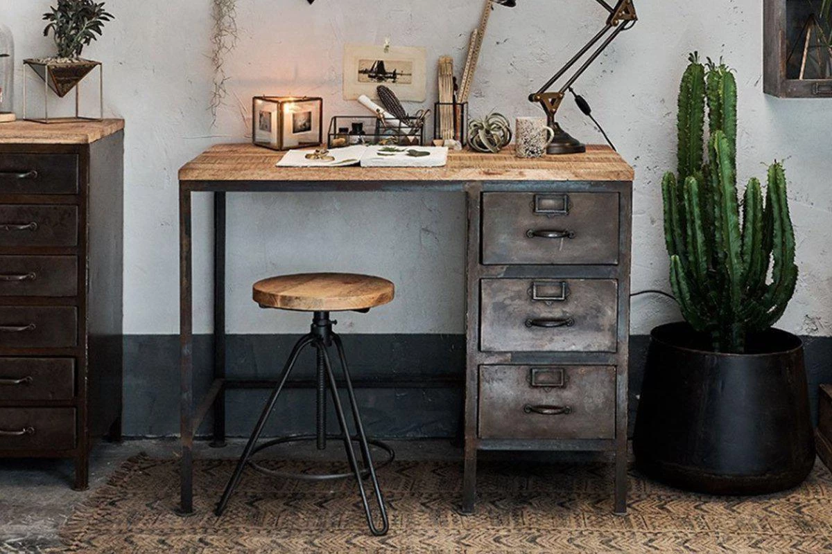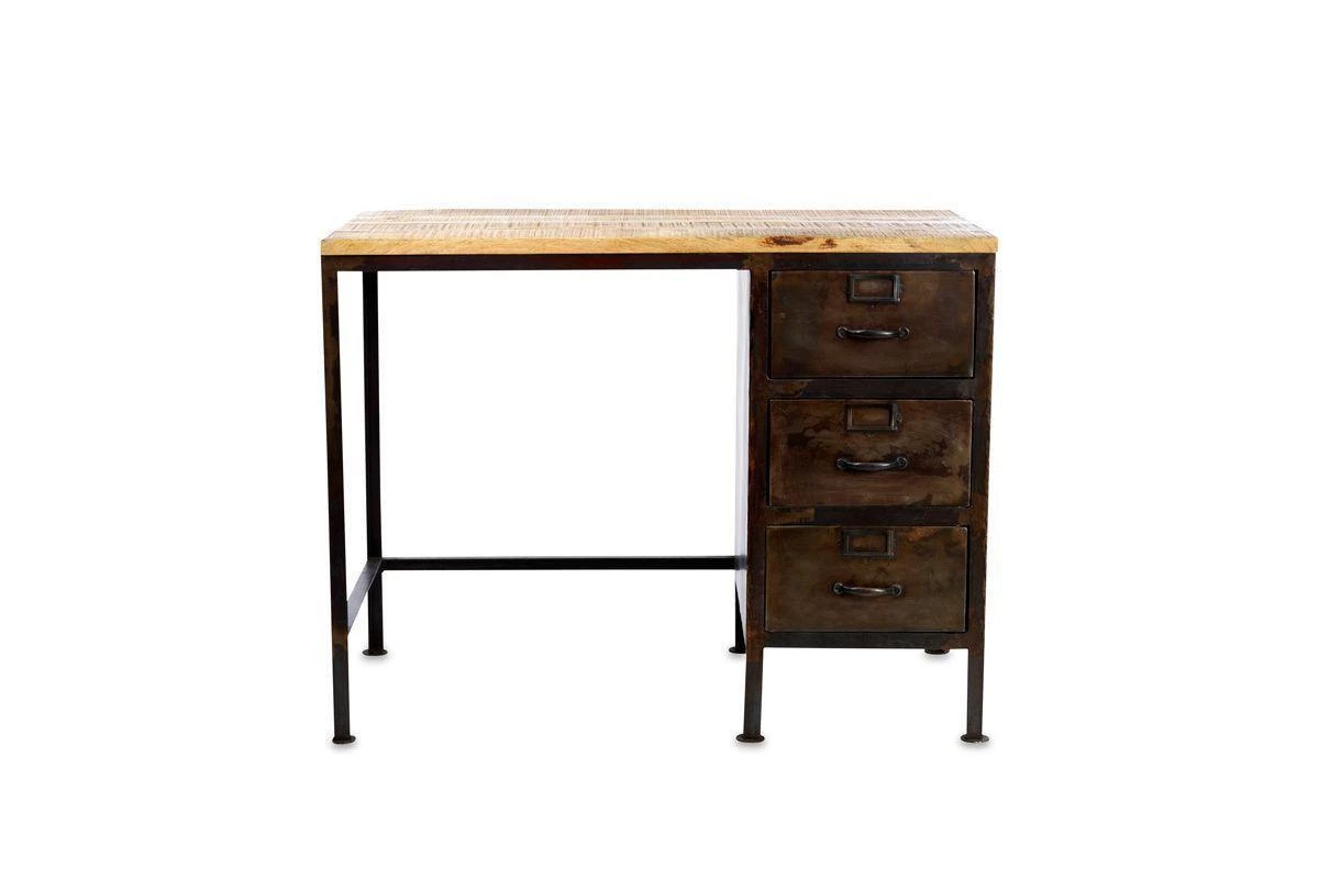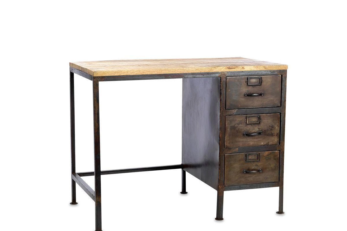 This timeless desk combines three metal drawers with a distressed black iron frame and a sustainable mango wood top.