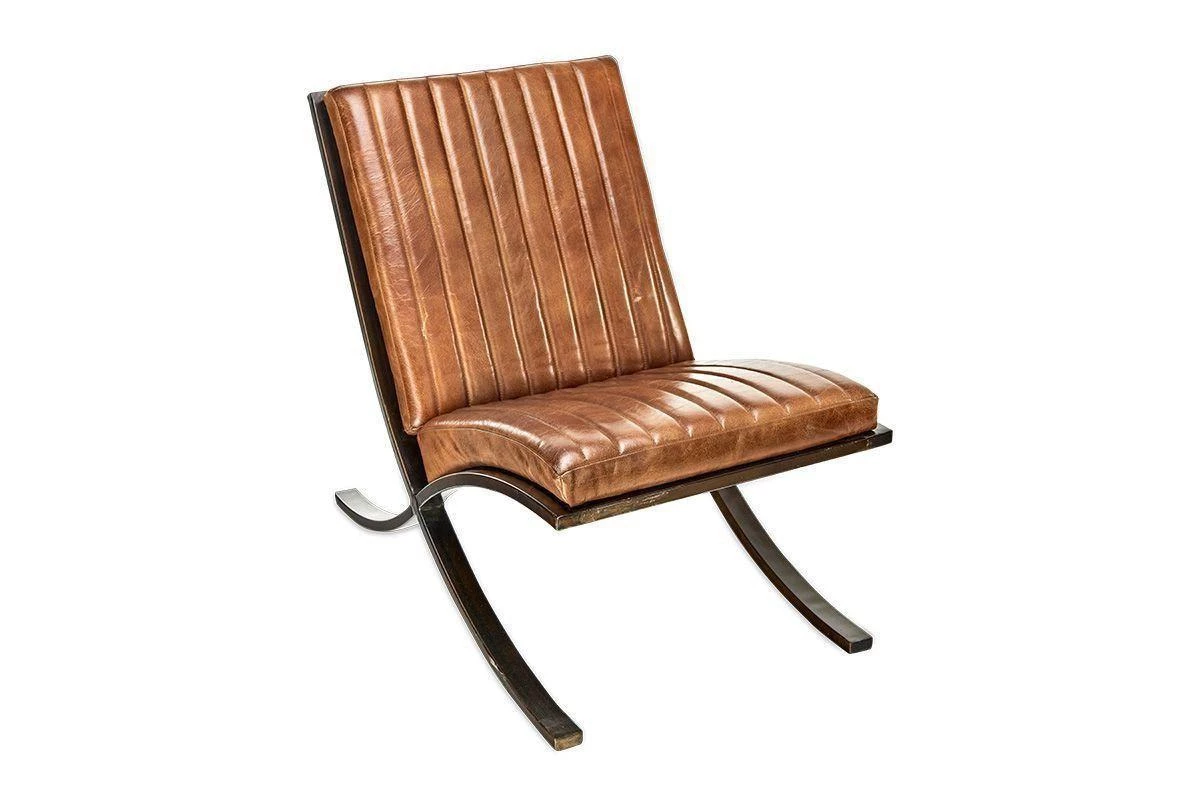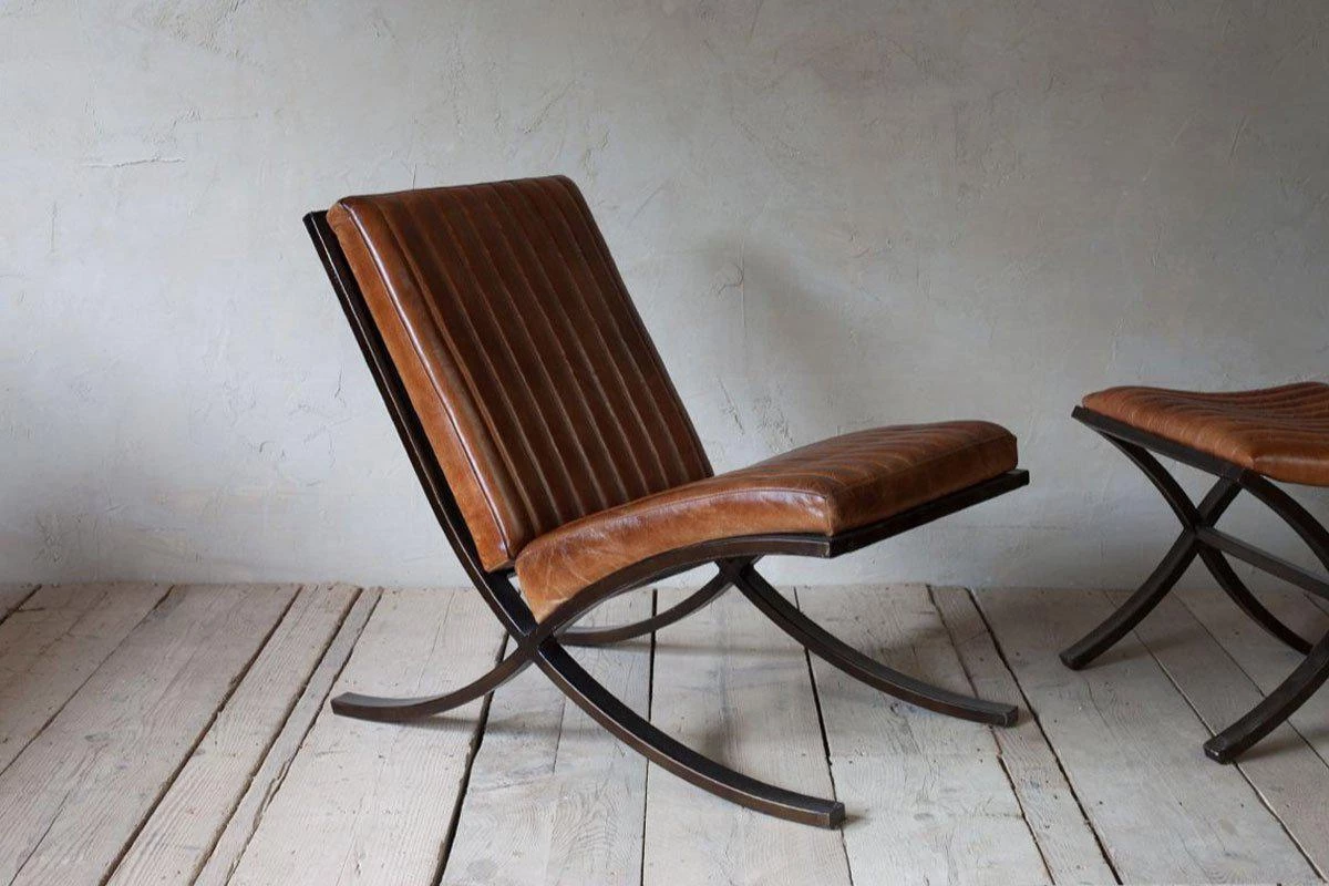 The stylish crossover design of this stylish masculine piece is made from dark iron, upholstered in aged tanned leather. The leather is padded for comfort and finished with a ribbed stitching design.