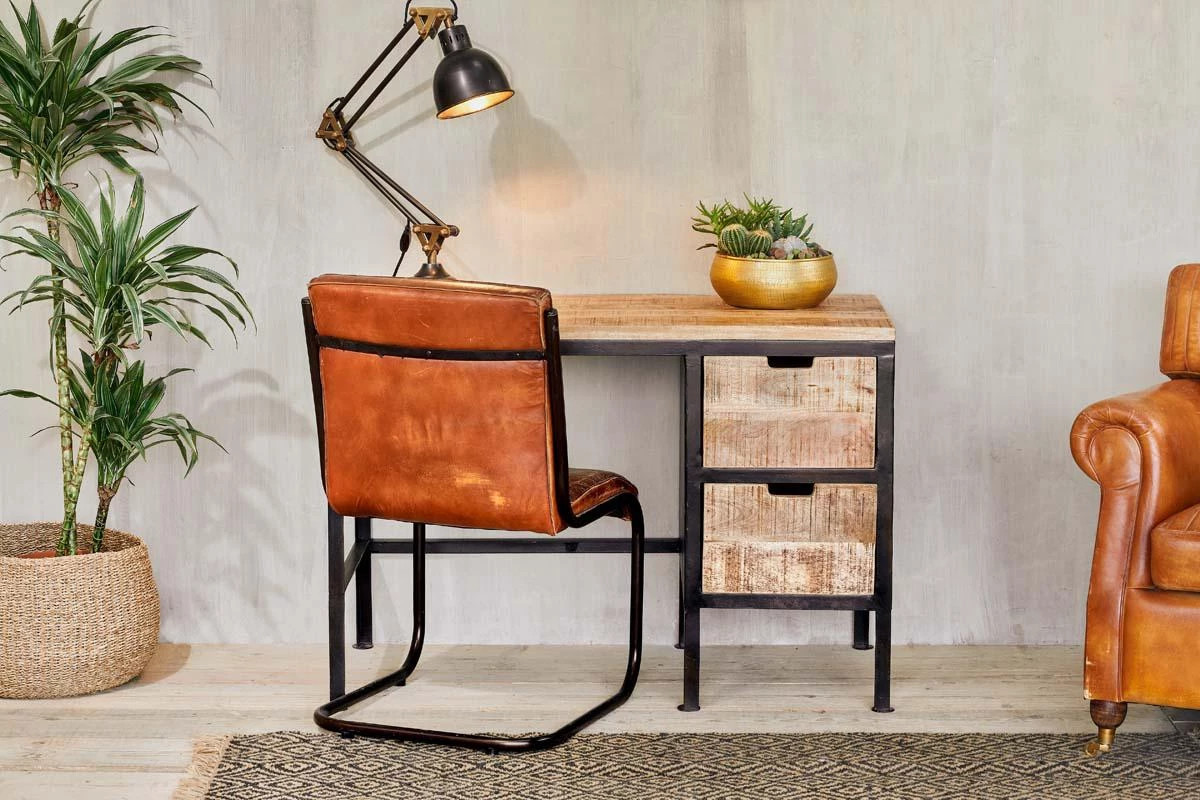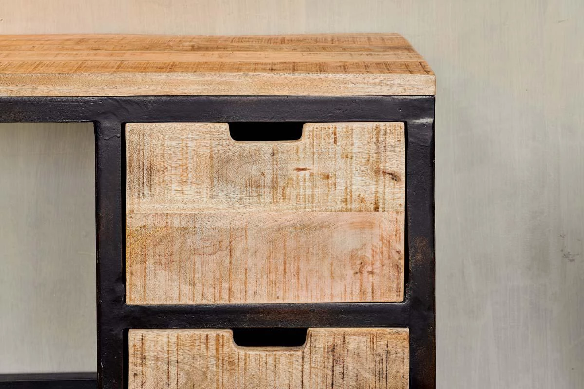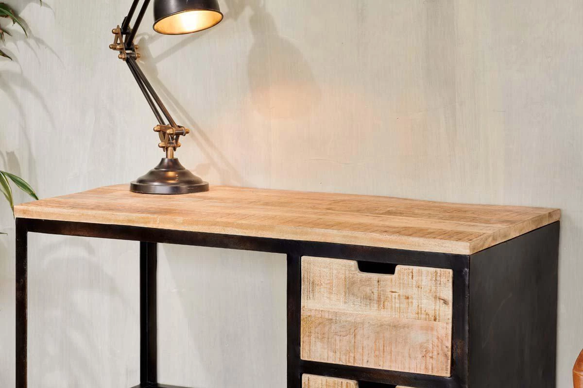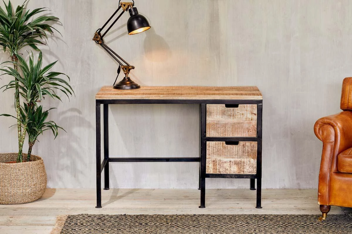 Thoughtful design and functionality are combined in this blend of industrial iron and sustainable mango wood. The Nermada Desk includes two generous wooden drawers with a simple cut opening. The clean design of the Nermada makes it a versatile desk, suited to the corner of a bedroom, living room or as a focus in a home office.