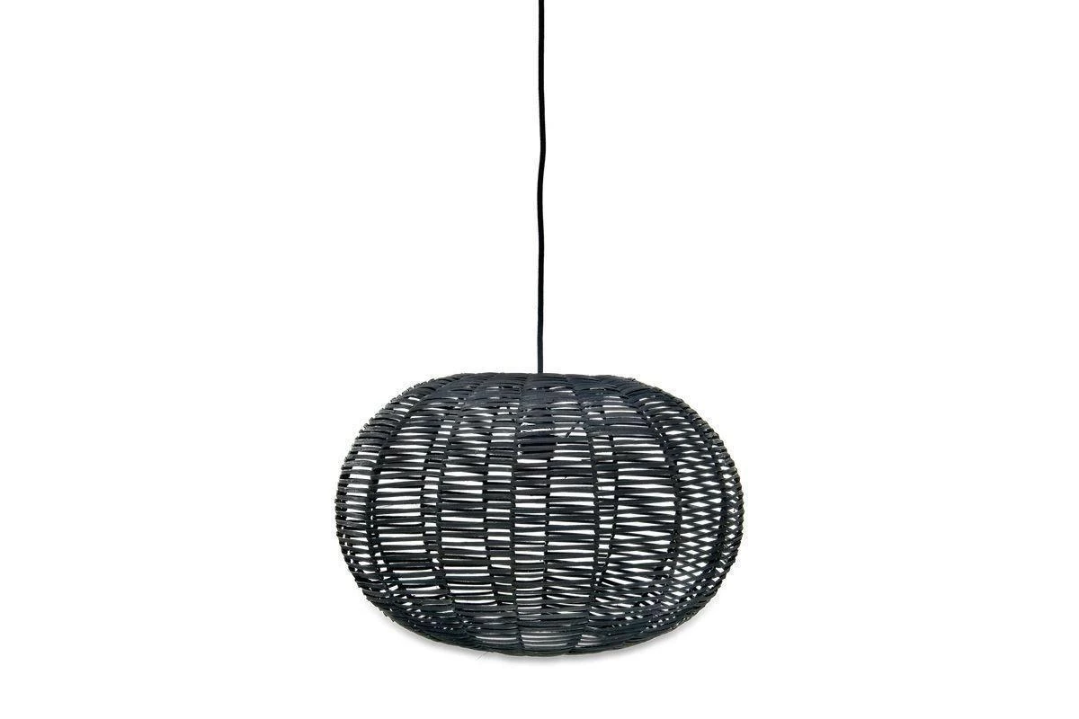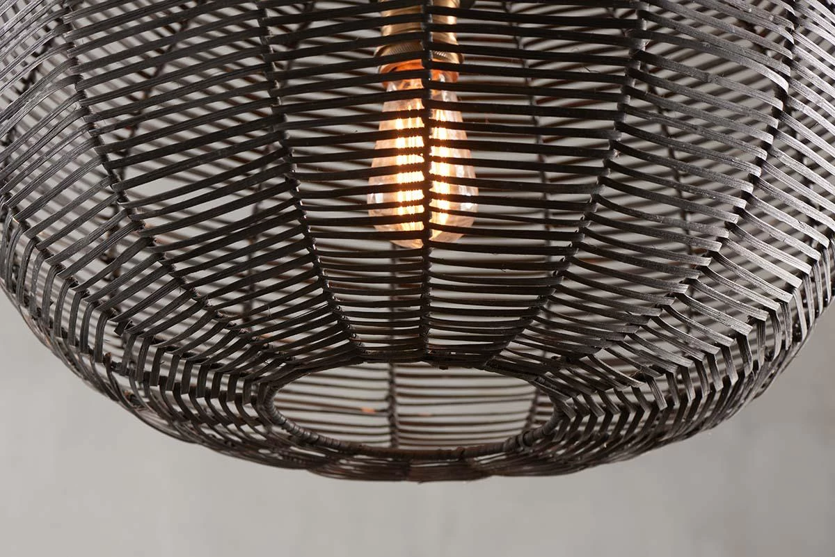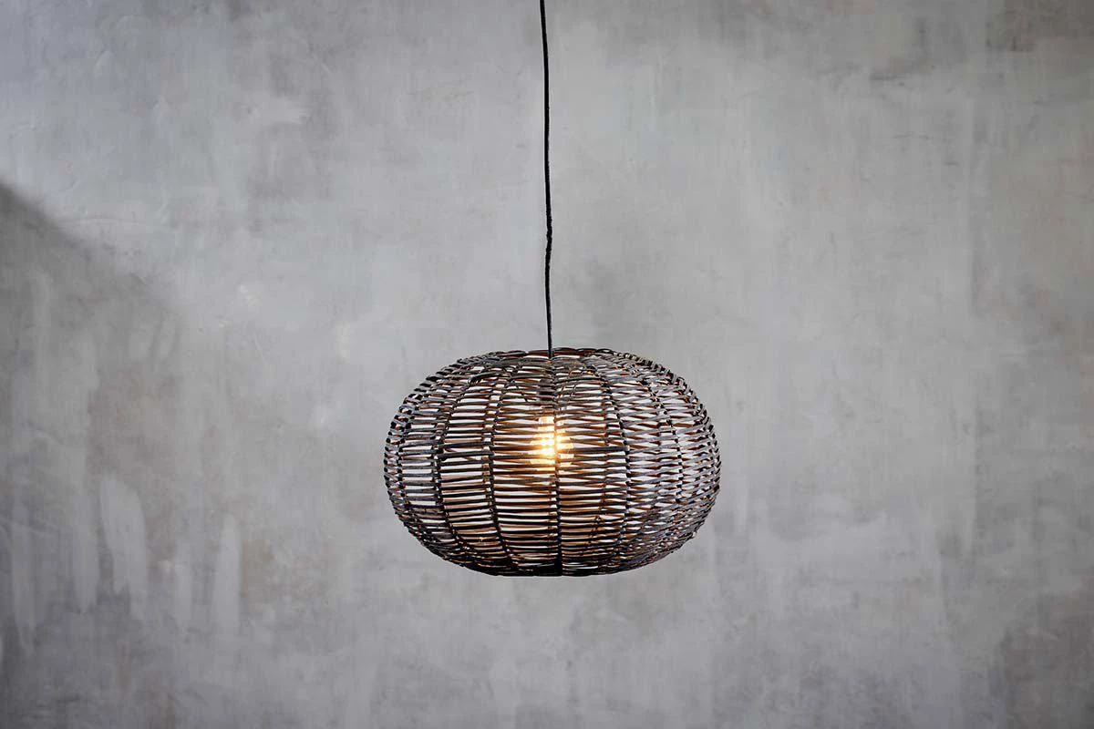 This spherical black wicker pendant-light is a well-designed and striking focal point. The Nordic style lampshade is finished with a black fabric cord (1.5m) and brass ceiling rose (14cm dia)