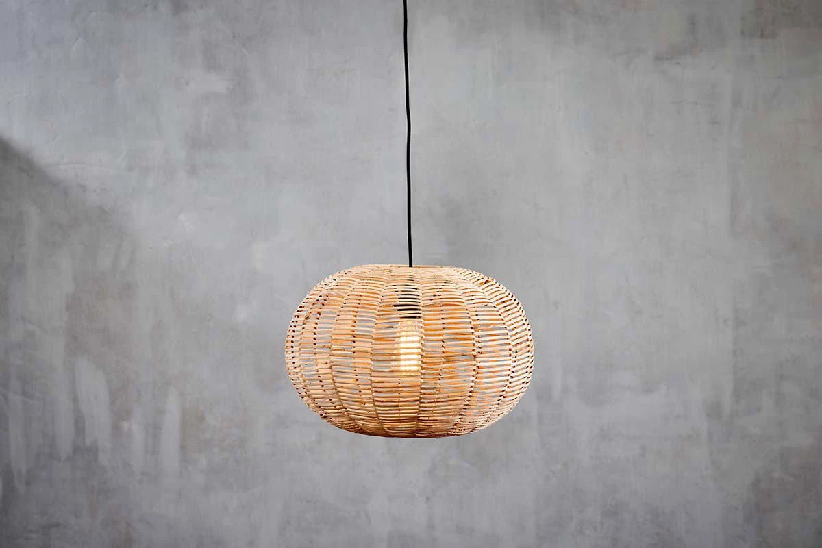 This spherical natural wicker pendant-light is beautifully constructed in a Nordic style. It is finished with a brass ceiling rose (14cm dia) and black fabric cord (1.5m).