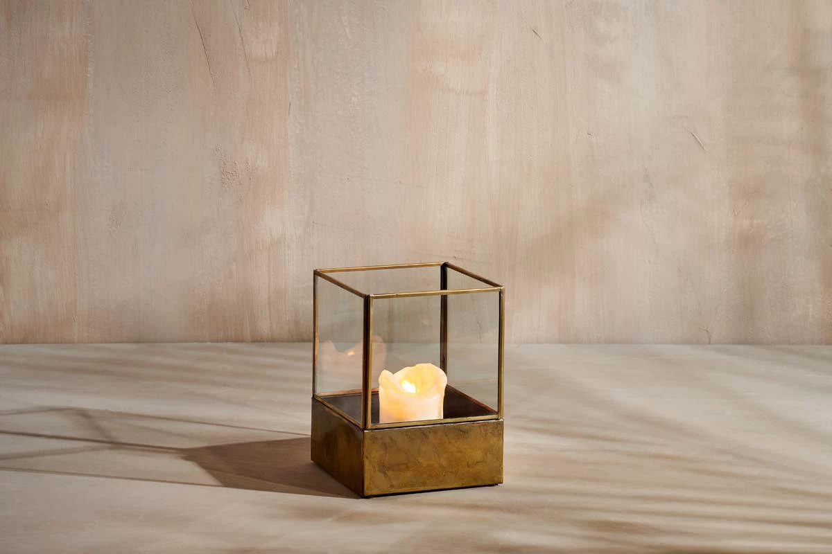 Set an ambient mood with soft candlelight from our Sampara Storm Lantern. The antique patina gives a feeling of age – old elegance, complemented with a simple box design. This lantern is perfect for a low church pillar candle or t-light.