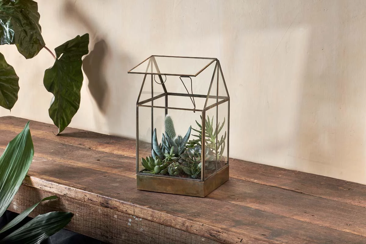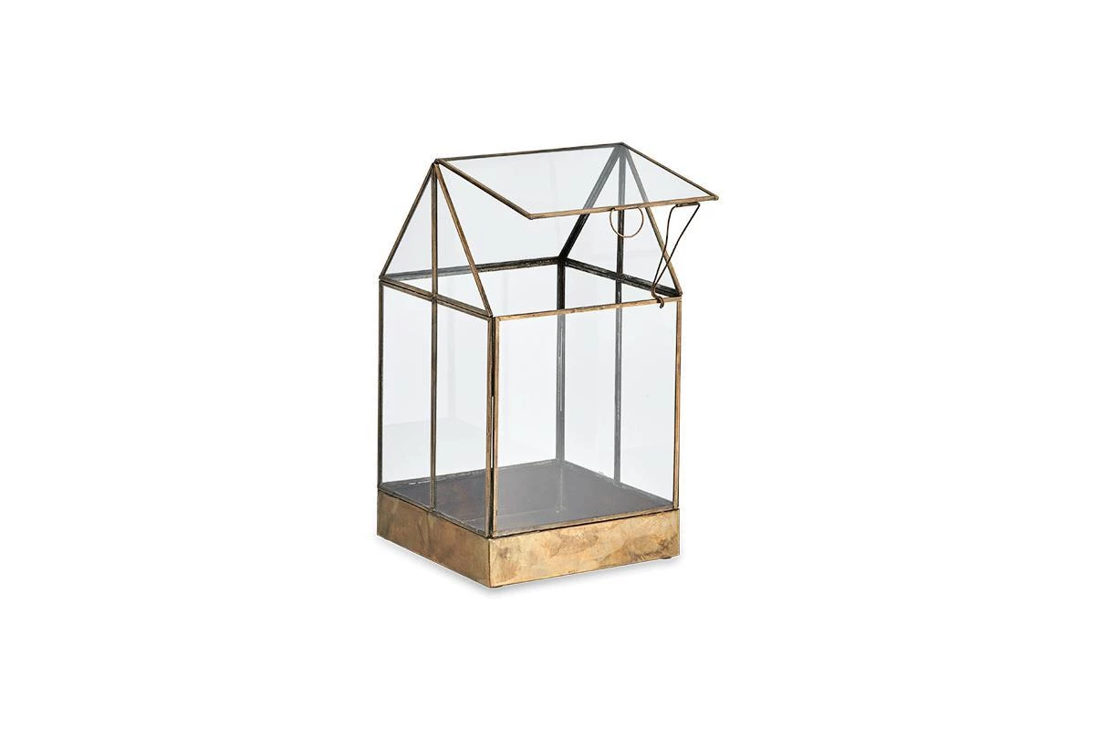 The refined brass contours of our Sampara Terrarium have an appealing antique patina and age-old charm. Complete with enchanting details, this table – top greenhouse has small opening roof for ventilation and a brass latch that supports it.