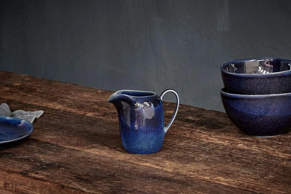 The striking indigo-sky blue hues of this endearing Dana jug have an eye catching tone. The smooth glaze, and organic shape offer a tactile artisan piece.