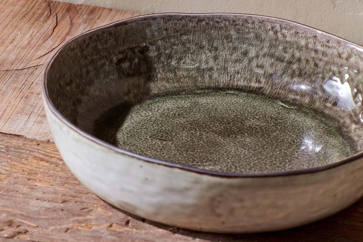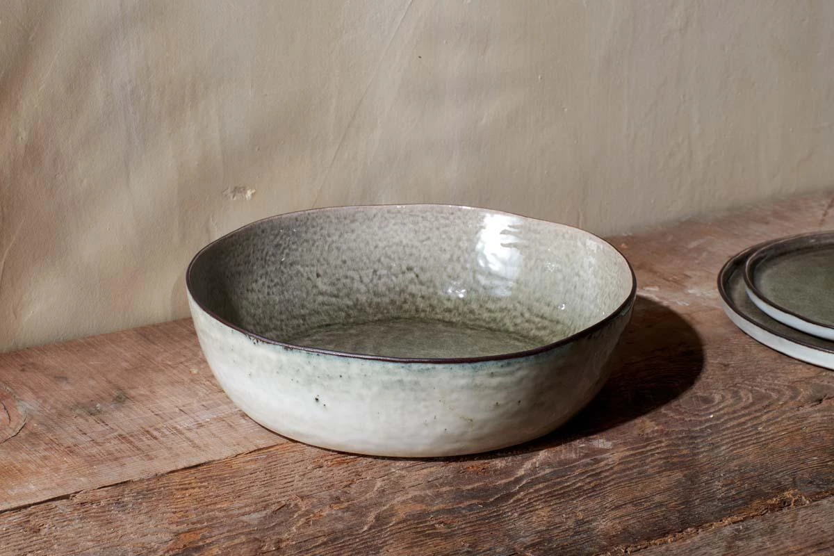 Generously proportioned, our large Simi Serving Bowl is perfect for larger gatherings. The sophisticated and mesmerising moss green glaze is beautifully contrasted against its off-white exterior.