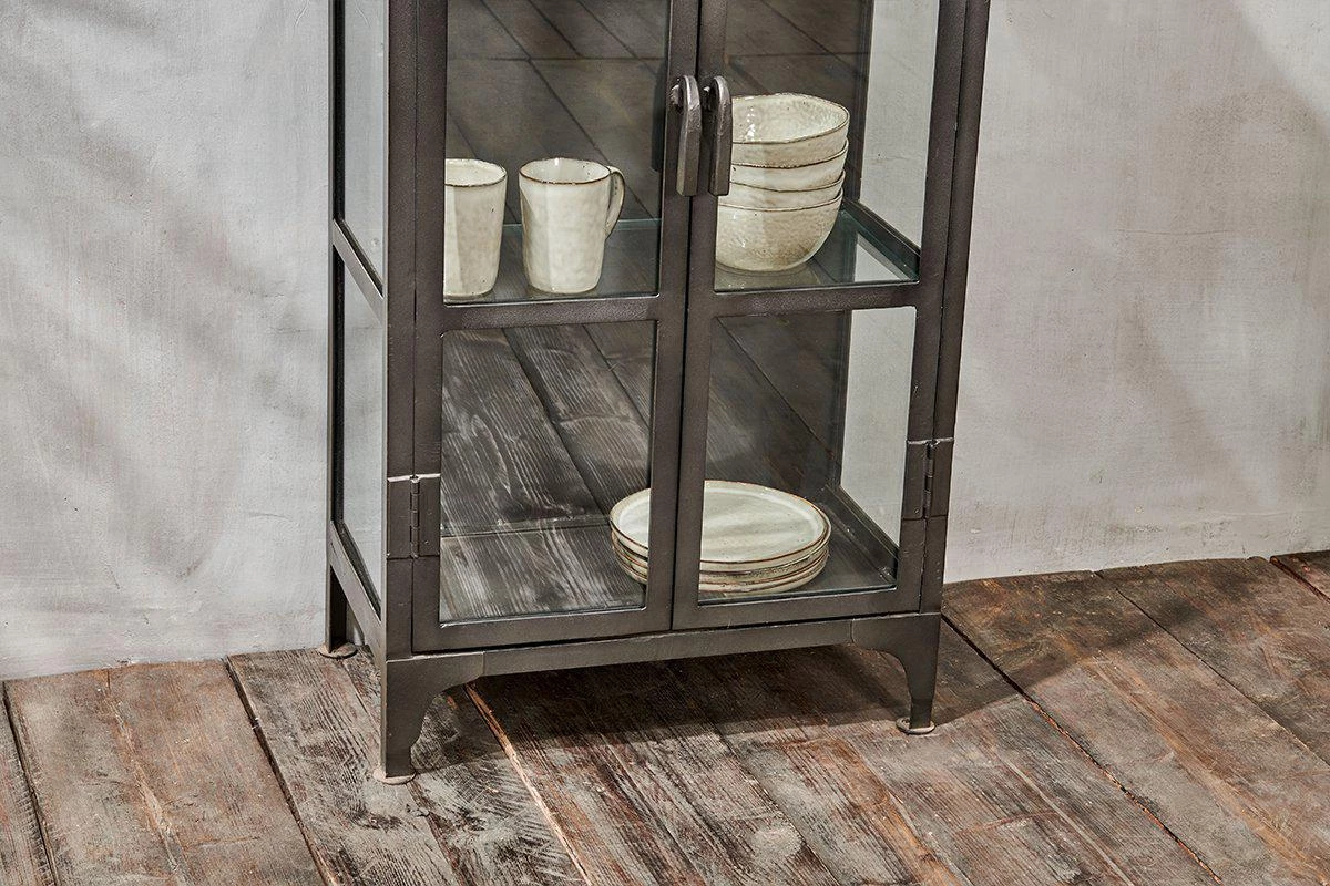 The thick iron frame suits this small cabinet. The glass shelves, front and sides add to the elegance of this practical piece.