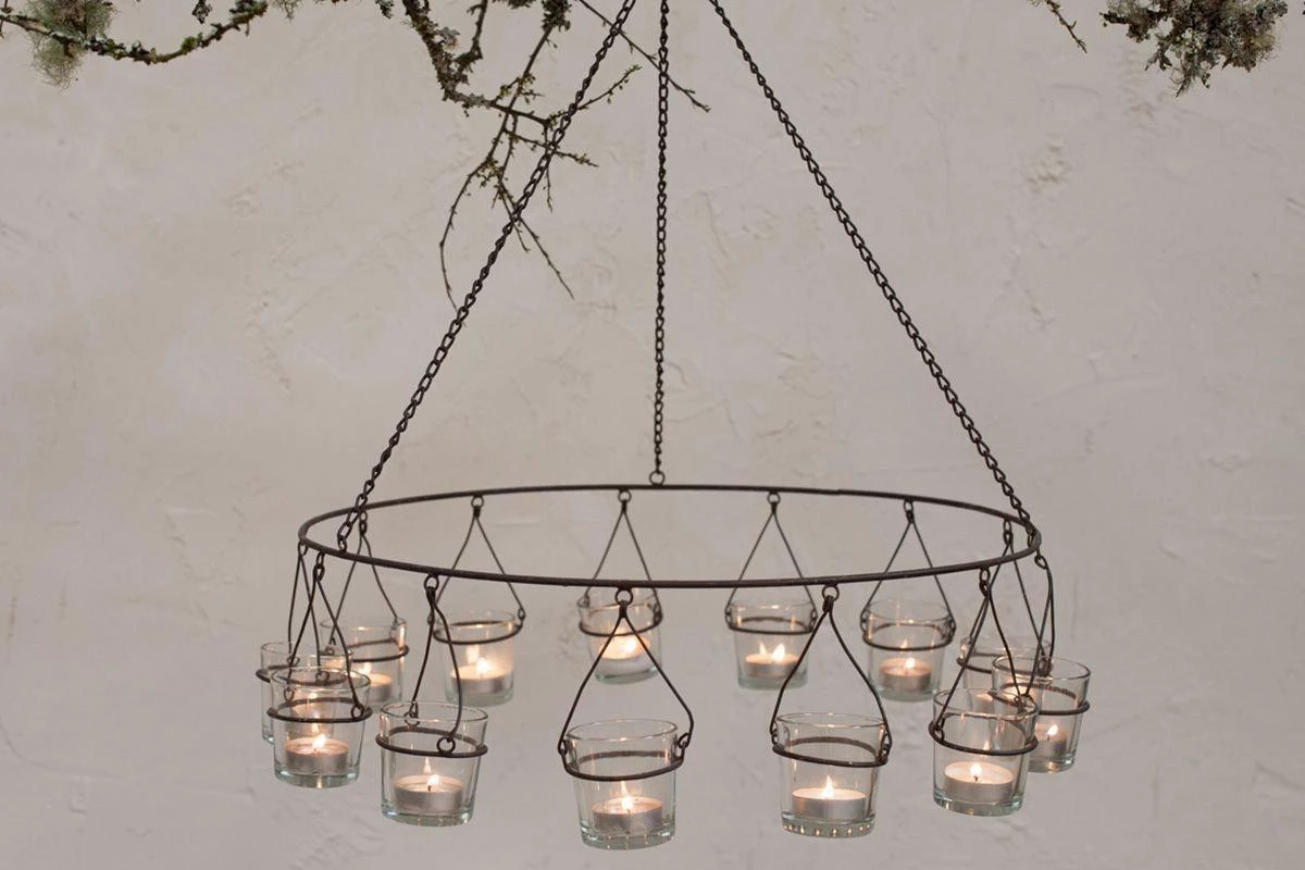 This rustic t-light chandelier makes an attractive hanging decoration.
