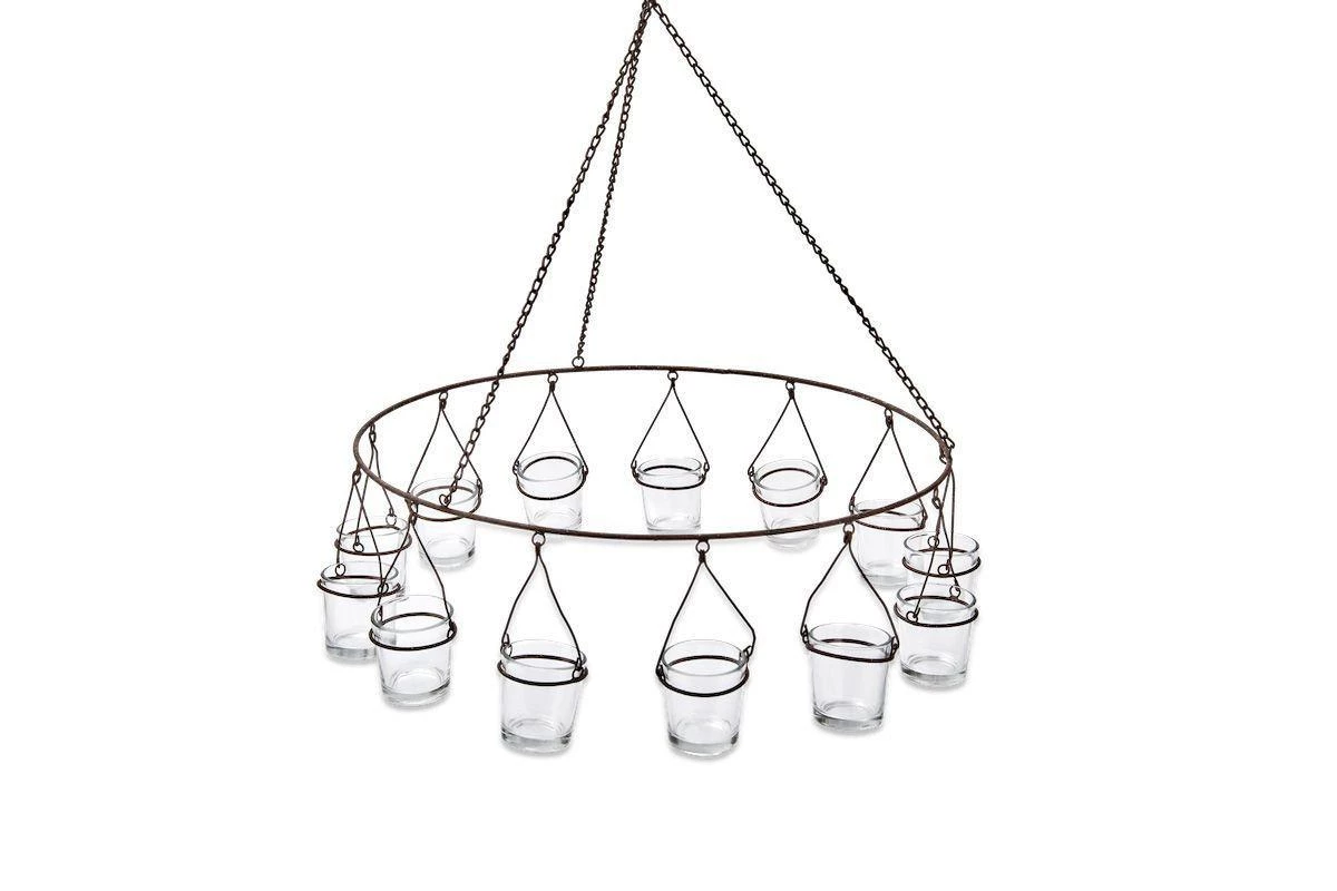 Fill each of its small glass holders with t-light candles and hang securely above a table inside or out.