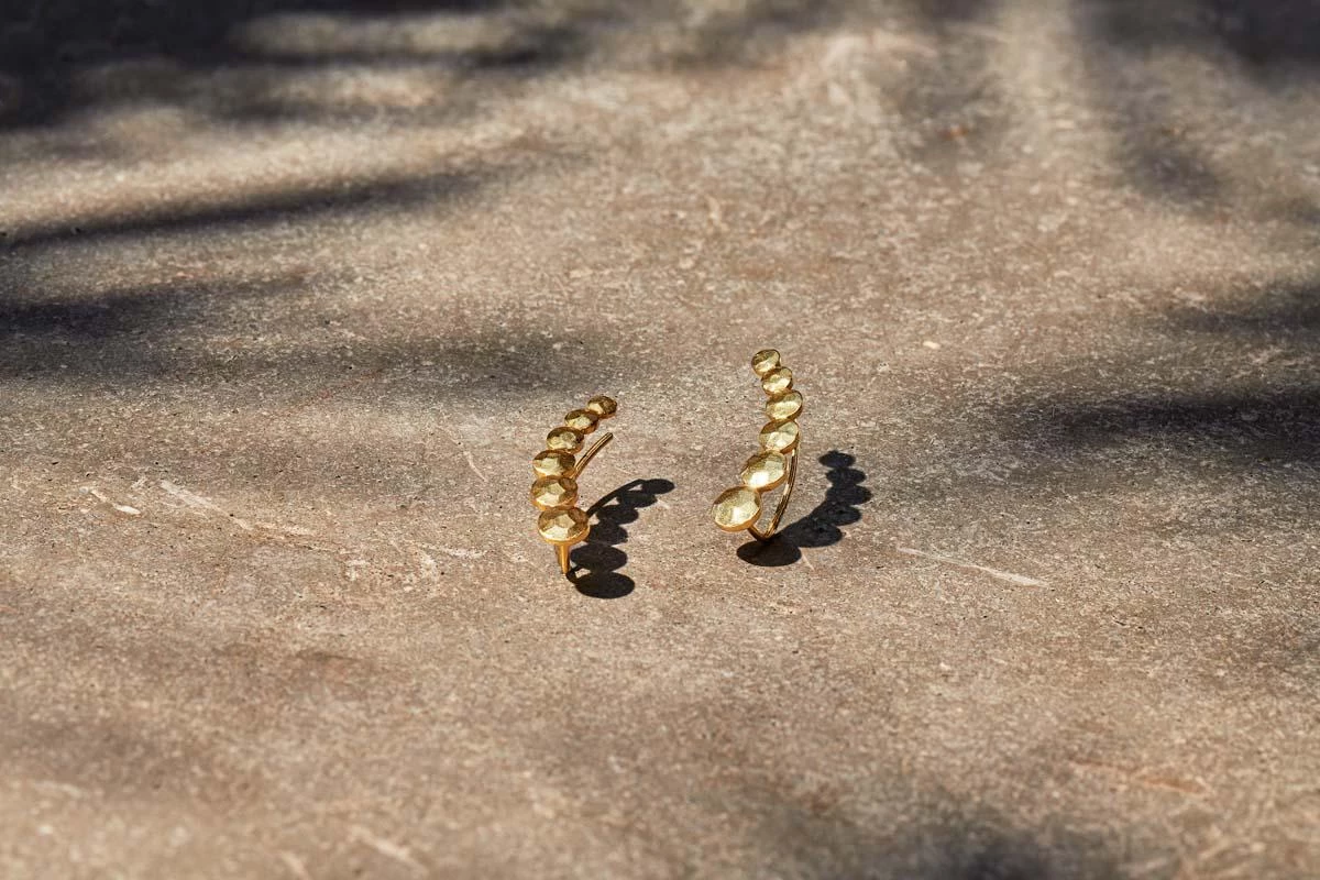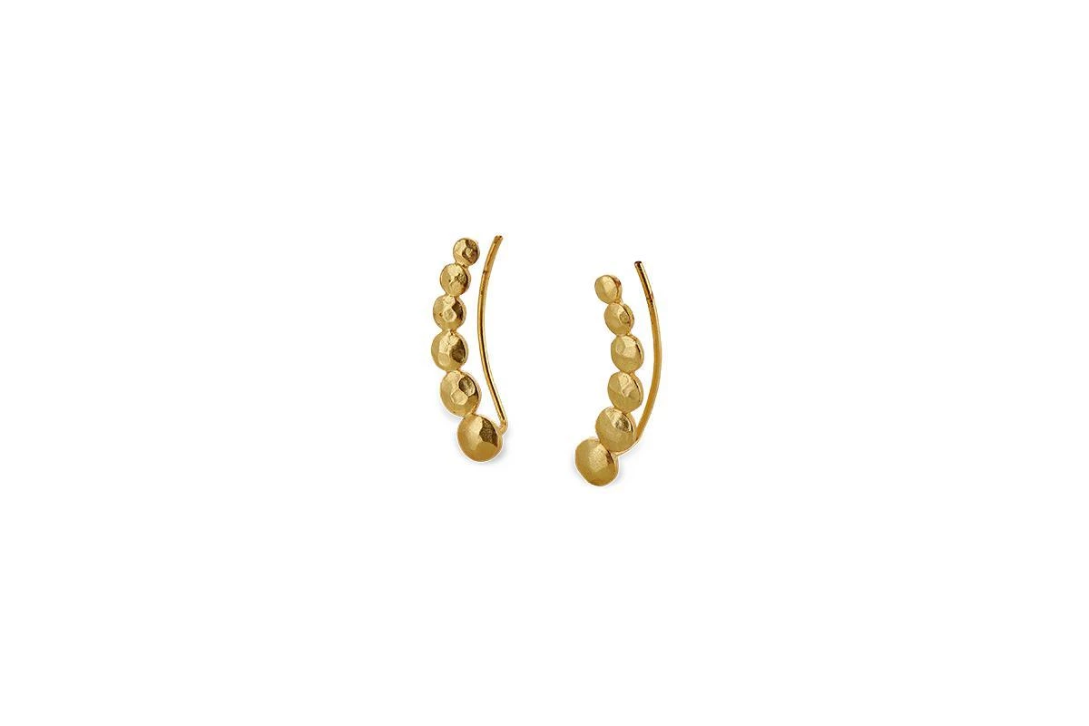 Our pair of Tripura Ear Climbers are beautifully crafted from 22 karat gold. The flat circular beaded detailing make for a stunning ear decorations.