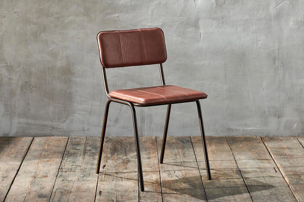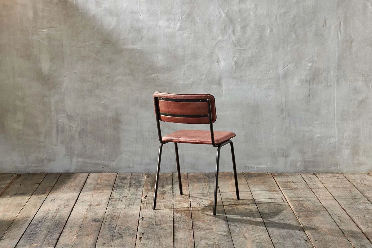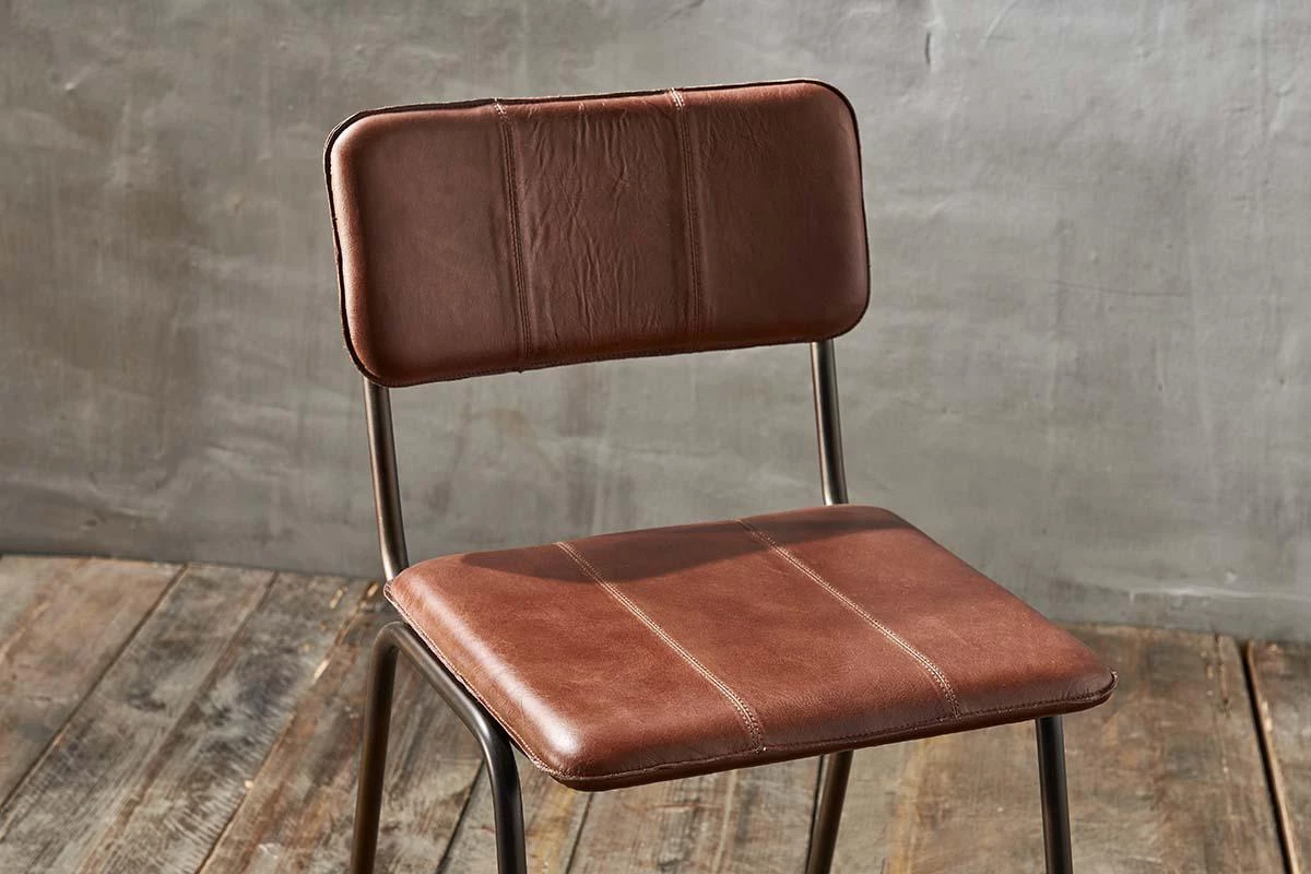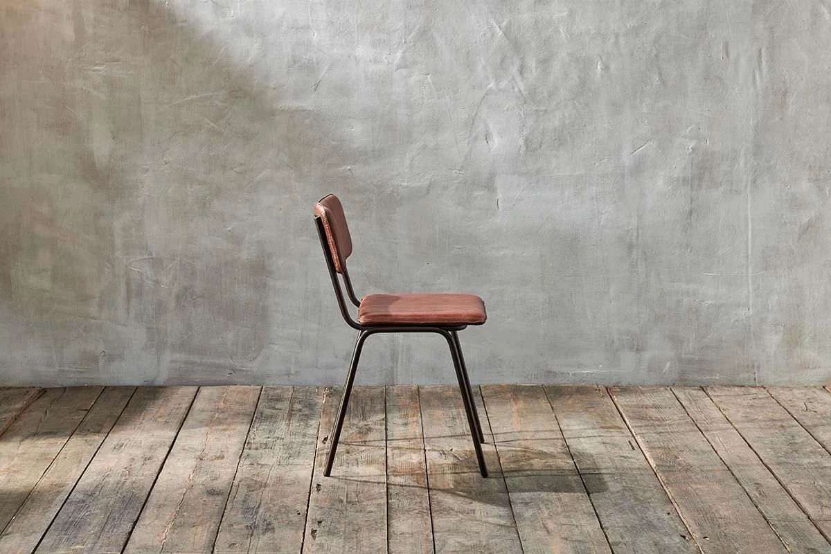 The rich brown hue of our leather Ukari dining chair offers both style and comfort. The upholstered leather seat and back are supported by a stylish iron frame.