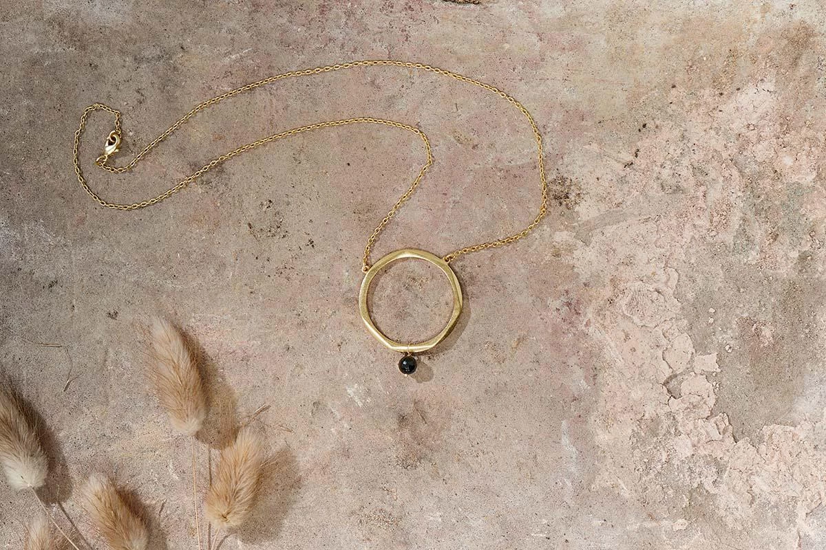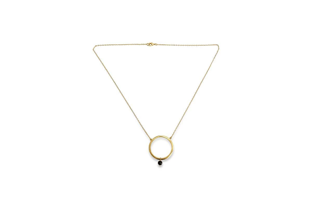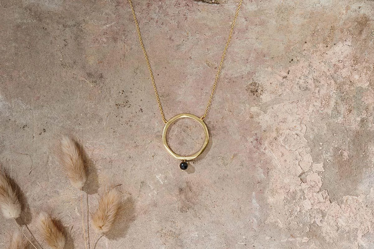 The elegant circular pendant of our Zana necklace has been delicately crafted and adorned with a single piece of Onyx. The jet black natural stone forms a striking contrast against the rich gold ring.