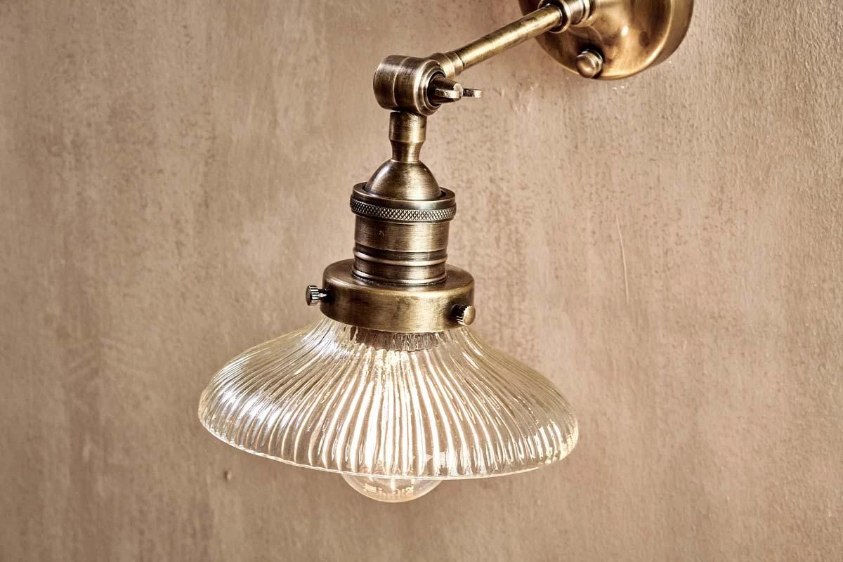 The shallow ribbed glass design of our small Zowi Wall Light is complimented beautifully by an antique brass arm.